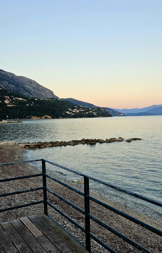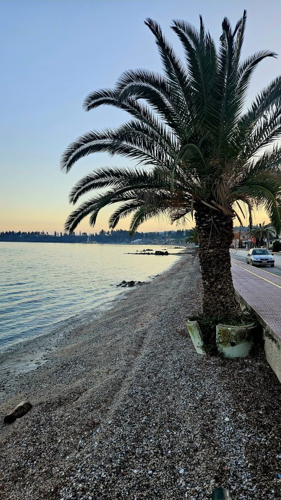 Ipsos Beach is a long, narrow beach along the road, with a beautiful promenade lined with palm trees.